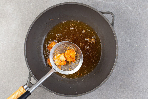 Die Pfanne oder den Wok ca. 1cm hoch mit Pflanzenöl befüllen und dieses bei mittlerer Hitze erwärmen. Ca. ⅓ der Garnelen in das heiße Öl geben und auf jeder Seite 1–2Min. knusprig und goldbraun frittieren. Vorsicht, die Garnelen können schnell zu dunkel werden. Auf etwas Küchenkrepp abtropfen lassen und die restlichen Garnelen in der gleichen Weise zubereiten.