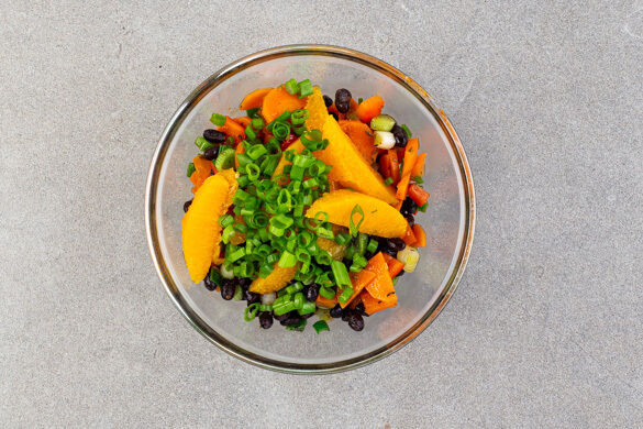 Die Orangen mit einem Messer so schälen, dass auch die weiße Haut entfernt wird. Das Fruchtfleisch in kleine Stücke schneiden und mit den Lauchzwiebeln und 2EL Essig unter das Bohnengemüse mengen. Den Salat mit Salz und Pfeffer abschmecken.