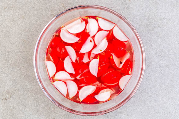 450ml Wasser in einem Wasserkocher aufkochen. In einer großen Schüssel 4EL Essig, 2TL Zucker, 1TL Salz, die ½ des geriebenen Ingwers und 1 kräftige Prise Chiliflocken vermengen. Das heiße Wasser und die Radieschen in die Schüssel geben und mit dem Einlegesud vermengen.