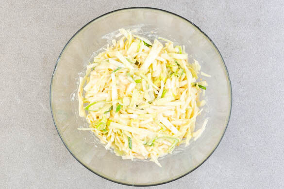 Die Kohlstreifen in einem Sieb abtropfen lassen und die überschüssige Flüssigkeit ausdrücken. Die Eier in die Schüssel aufschlagen und mit einer Gabel verquirlen. Die Kohlstreifen, das Sesamöl und 200ml Wasser untermengen. Den restlichen geriebenen Ingwer und die Lauchzwiebelringe unterheben.