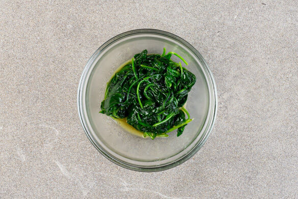 Den Spinat in einer mittelgroßen Pfanne mit ½EL Butter bei mittlerer bis niedriger Hitze 2–3Min. garen, dabei mit einer Gabel überschüssiges Wasser aus dem Spinat drücken. Den Spinat in einer Schüssel beiseitestellen, dabei möglichst viel Flüssigkeit in der Pfanne zurückbehalten und entsorgen. Die Pfanne auswischen.