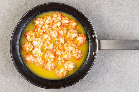 Die Garnelen in einem Sieb mit kaltem Wasser abspülen und mit etwas Küchenkrepp trocken tupfen, dann in der Pfanne mit 1EL Butter bei starker Hitze in 2–3Min. rosa und gar braten. Den Knoblauch hinzufügen und ca. 20Sek. mitbraten. Die Garnelen mit je 1 Prise Salz und Pfeffer würzen.