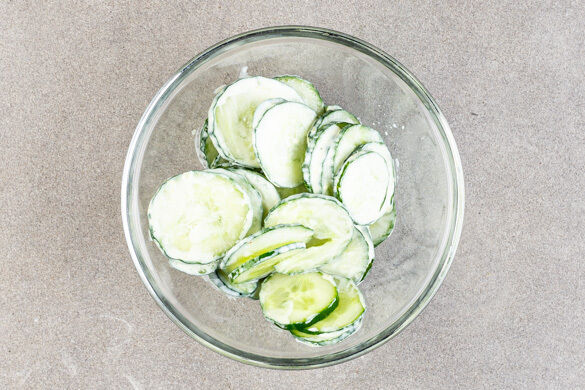 Die ½ des Meerrettichs schälen und fein reiben, dann nach Geschmack mit 1EL Mayonnaise und 1TL hellem Essig verrühren und das Dressing mit Salz abschmecken. Die Gurke in dünne Scheiben schneiden. Die Gurke und das Dressing bis zum Servieren separat beiseitestellen.