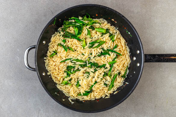 Die Brokkolini und 75ml Wasser in die Sauce rühren. Dann die Pasta samt Pastawasser untermengen und 2–3Min. bei niedriger bis mittlerer Hitze kochen, bis die Pasta gar ist und die Brokkolini leuchtend grün sind. Ggf. etwas mehr Wasser hinzugeben, um eine cremige, sämige Konsistenz zu erhalten.