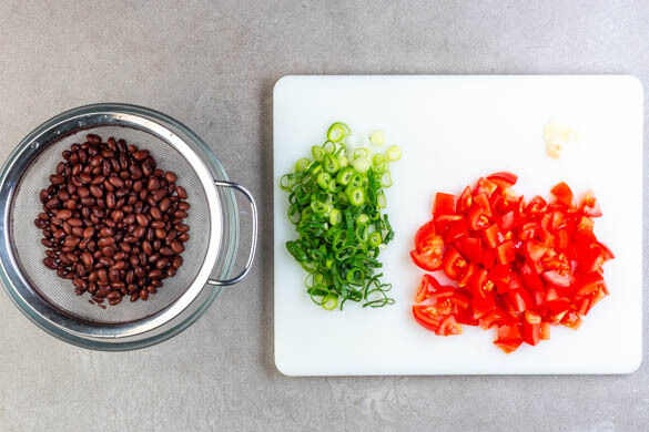 Den Backofen auf 230°C (210°C Umluft) vorheizen. Die Tomaten in ca. 1cm große Würfel schneiden. Die Lauchzwiebel in feine Ringe schneiden. Den Knoblauch schälen und in dünne Scheiben schneiden. Die Bohnen in einem Sieb mit kaltem Wasser abspülen und abtropfen lassen.