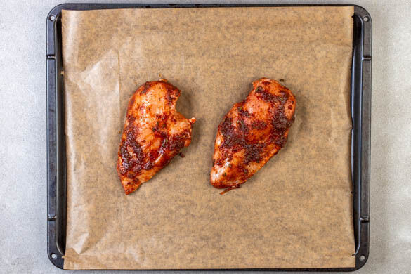 Die Gewürzmischung mit 1EL Olivenöl und je 1 Prise Salz und Pfeffer verrühren. Das Fleisch mit etwas Küchenkrepp trocken tupfen und mit dem Gewürzöl vermengen, dann auf ein mit Backpapier ausgelegtes Blech (oder in eine mittelgroße Auflaufform) geben und im Ofen in 20–25Min. gar backen.