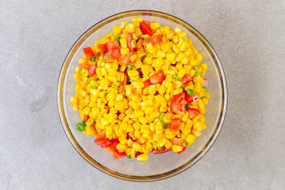 Den Mais in ein Sieb abgießen und abspülen. Die Tomaten fein würfeln. 1 Lauchzwiebel in feine Ringe schneiden. ½TL Zucker in 2TL Essig auflösen, den Mais, die Tomaten und die Lauchzwiebelringe unterheben und die Salsa mit Salz und Pfeffer würzen.