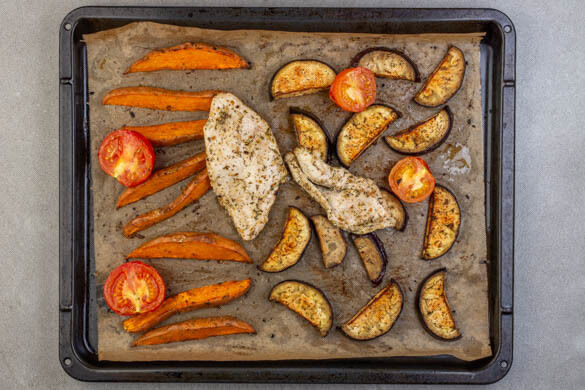 Das Fleisch und die Tomaten nach ca. 20Min. Garzeit zu dem Gemüse auf die Backbleche geben und im Ofen 10–15Min. backen, bis das Fleisch gar und das Gemüse appetitlich gebräunt ist. Nach der Hälfte der Zeit die Position der Bleche tauschen.