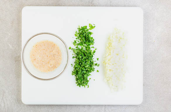 Die ½ der Semmelbrösel in einer kleinen Schüssel mit 50ml Wasser vermengen und einweichen lassen. Die Zwiebel schälen und fein würfeln. Die Petersilie samt Stängeln sehr fein schneiden.