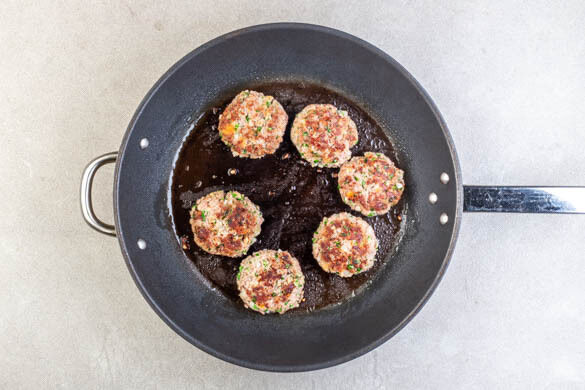 Die Fleischbällchen in einer mittelgroßen Pfanne mit 1TL Pflanzenöl bei mittlerer Hitze auf jeder Seite 3–4Min. anbraten.