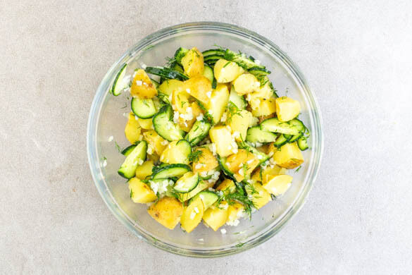 Die Gurke längs halbieren und in sehr dünne Scheiben schneiden. Den Dill fein schneiden. Die Gurken und die ½ des Dills oder mehr nach Geschmack mit den Kartoffeln und den restlichen Zwiebeln vermengen. Je 2TL Pflanzenöl, Essig und Wasser zugeben und mit Salz und Pfeffer abschmecken.