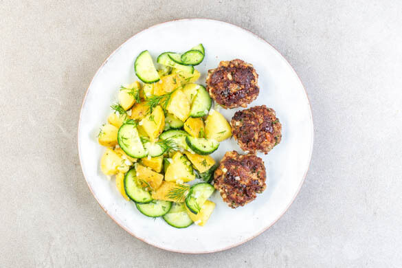 Die Rinderbällchen mit dem Kartoffel-Gurken-Salat anrichten und servieren.