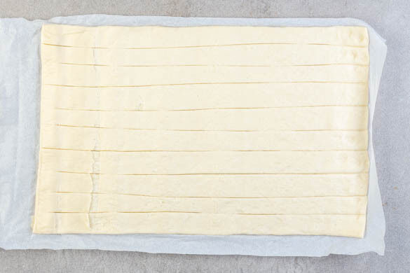 Den Backofen auf 210°C (190°C Umluft) vorheizen. Die Teige mit dem Papier nach unten auf einem Schneidebrett ausrollen, dann jeweils längs in 10 Streifen schneiden.