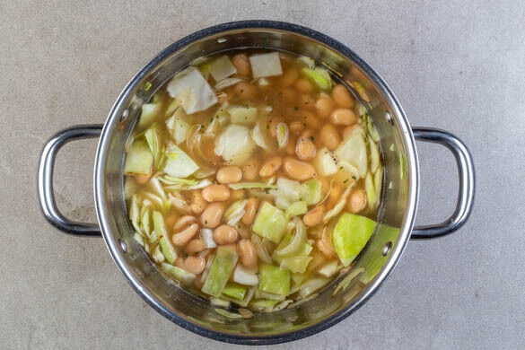 In einem großen Topf 1EL Butter bei mittlerer Hitze schmelzen. Die Zwiebeln mit 1EL Olivenöl zugeben und in ca. 1Min. glasig dünsten. Dann den Weißkohl ca. 3Min. mitbraten. Mit ½TL Salz würzen, die Brühe angießen und abgedeckt aufkochen lassen. Die Bohnen und 6EL Bohnenflüssigkeit hinzugeben und abgedeckt ca. 5Min. kochen, bis der Weißkohl weich ist.