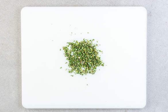 Die Rosmarinnadeln abzupfen und fein schneiden. Die Thymianblättchen abstreifen und ebenfalls fein schneiden.