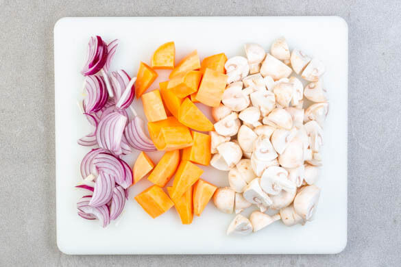 Den Backofen auf 220°C (200°C Umluft) vorheizen. In einem mittelgroßen Topf ausreichend Wasser für die Süßkartoffeln zum Kochen bringen. Die Süßkartoffeln schälen und in ca. 3cm große Stücke schneiden. Die Pilze ggf. säubern und vierteln. Die Zwiebeln schälen, halbieren und in feine Streifen schneiden.