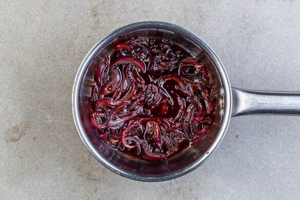 Die Zwiebeln mit 4TL Butter, 5EL Balsamicoessig, 2½EL Zucker, ½TL Salz und 1 Prise Pfeffer in einen kleinen Topf geben und alles bei niedriger bis mittlerer Hitze unter häufigem Rühren 8–10Min. köcheln lassen, bis die Zwiebeln weich und etwas klebrig sind.