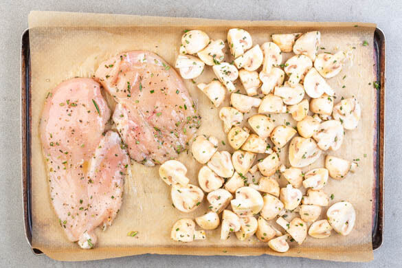 Das Fleisch mit etwas Küchenkrepp trocken tupfen und horizontal in je 2 gleich große Stücke schneiden. Das Fleisch und die Pilze mit 2EL Olivenöl, ¾ der Kräuter oder mehr und 1TL Salz vermengen. Beides auf ein mit Backpapier ausgelegtes Blech geben und im Ofen ca. 8Min. backen, bis das Fleisch gar ist und die Pilze weich sind.