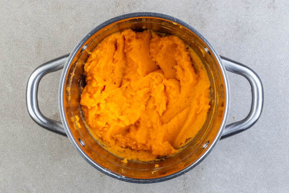 Die Süßkartoffeln in das kochende Wasser geben und abgedeckt in ca. 10Min. weich kochen. 1 Tasse Kochwasser abschöpfen, dann die Süßkartoffeln in ein Sieb abgießen, zurück in den Topf geben und abgedeckt warm halten.