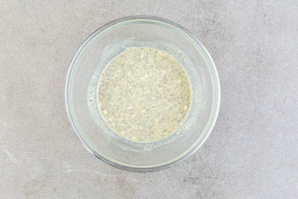 In einer kleinen Schüssel 100ml Milch und ½EL Senf mit einem Schneebesen verrühren, dann 2EL Mehl, ca. ¾ der Gewürzmischung, ½TL Salz und 1 kräftige Prise Pfeffer unterrühren, bis eine dickflüssige Creme entsteht.