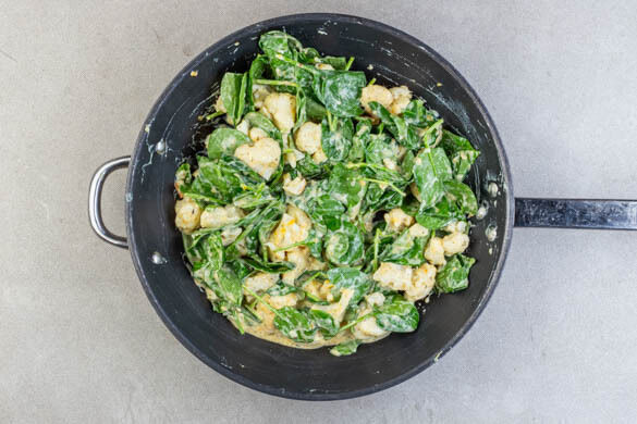 Die Pfanne erneut stark erhitzen. Die Creme und 300ml Milch in die Pfanne geben und unter Rühren aufkochen lassen. Ca. 2Min. köcheln lassen, dann mit ca. 100ml Kochwasser ablöschen und ca. ⅔ des Käses sowie den Spinat und den Blumenkohl untermengen.