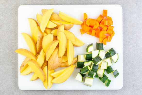 Den Backofen auf 220°C (200°C Umluft) vorheizen. Die Kartoffeln samt Schale in Spalten schneiden. Die Zucchini längs vierteln und quer in 2–3cm große Stücke schneiden. Die Karotte ggf. schälen, längs halbieren und quer in ca. 1cm dicke Scheiben schneiden.