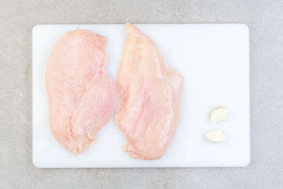 Den Knoblauch schälen und halbieren. Das Fleisch mit etwas Küchenkrepp trocken tupfen, jeweils horizontal halbieren und mit je 1 Prise Salz und Pfeffer würzen.