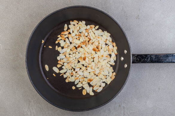 Die Mandelblättchen in einer großen Pfanne ohne Zugabe von Fett bei mittlerer Hitze 1–2Min. goldbraun anrösten. Vorsicht, sie können schnell zu dunkel werden. Zum Abkühlen aus der Pfanne nehmen und beiseitestellen.
