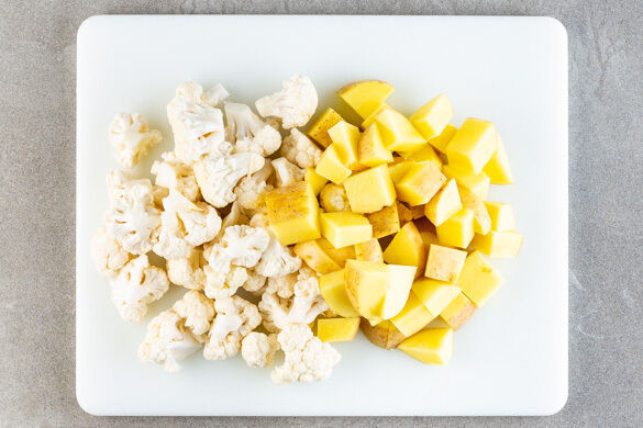 Den Backofen mit Grillfunktion oder Ober-/Unterhitze auf 220°C vorheizen. Den Blumenkohl in mundgerechte Röschen schneiden. Die Kartoffeln ggf. schälen und ebenfalls in mundgerechte Stücke schneiden, etwa so groß wie die Blumenkohlröschen. In einem mittelgroßen Topf 800ml leicht gesalzenes Wasser für den Reis zum Kochen bringen.