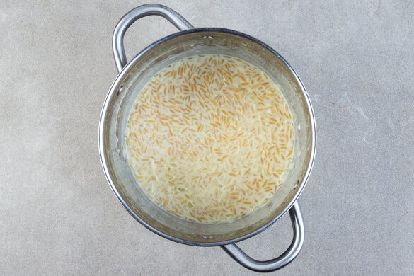 Die Zwiebeln und die Risoni in einem großen Topf mit 1EL Olivenöl bei mittlere Hitze ca. 1Min. anbraten. Mit 300ml Soja-Brühe ablöschen und unter gelegentlichem Rühren ca. 3Min. köcheln lassen. Dann alle 2Min. 150–200ml Soja-Brühe nachgießen und unter Rühren verköcheln lassen, bis die Risoni bissfest sind. Evtl. wird nicht die ganze Flüssigkeit benötigt.