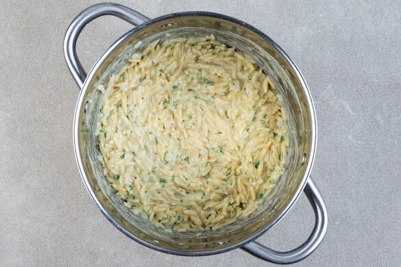 Die Zwiebeln und die Risoni in einem großen Topf mit 2EL Olivenöl bei mittlere Hitze ca. 1Min. anbraten. Mit 300ml Soja-Brühe ablöschen und unter gelegentlichem Rühren ca. 3Min. köcheln lassen. Dann alle 2Min. 150–200ml Soja-Brühe nachgießen und unter Rühren verköcheln lassen, bis die Risoni bissfest sind. Evtl. wird nicht die ganze Flüssigkeit benötigt.