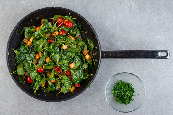 Nebenher die Tomaten halbieren und mit dem Spinat zum Tofu in die Pfanne geben. 3EL Wasser und das übrige Brühgewürz unterrühren und das Gemüse abgedeckt 5–6Min. garen, bis die Tomaten weich sind. Die Petersilie samt Stängeln fein hacken.
