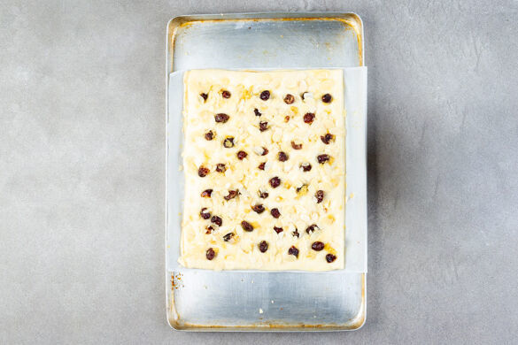 Focaccia ist ein Klassiker, und das im buchstäblichsten Sinne des Wortes: Das fluffige Brot gab es schon bei den Etruskern und alten Griechen! Natürlich gab es im Wandel der Zeiten immer mal wieder ein paar Neuerungen, was den Belag angeht – heute backen wir beispielsweise eine Dessert-Variante mit getrockneten Cranberrys und süßen Datteln. Dazu ein aromatischer Orangen-Minz-Sirup und Crème fraîche mit Ahornsirup – lecker!