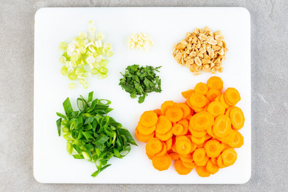 In einem Wasserkocher 1L Wasser für die Nudeln zum Kochen bringen. Den Knoblauch schälen und fein würfeln. Den Koriander samt Stängeln grob schneiden. Die Erdnüsse grob hacken. Den weißen Teil der Lauchzwiebel fein würfeln, den grünen Teil in Ringe schneiden. Die Karotte ggf. schälen und in dünne Scheiben schneiden.