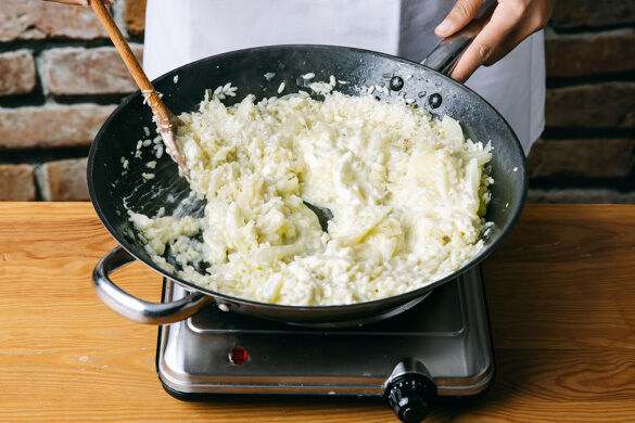 Den Fenchel halbieren, vom Strunk befreien und in ca. 0,5cm dünne Spalten schneiden, evtl. nochmals halbieren. 4–6 Spalten für später beiseitelegen. Das Fenchelgrün für die Garnitur beiseitelegen. Die Zwiebeln in einer großen Pfanne mit 1EL Olivenöl bei mittlerer Hitze 1–2Min. glasig anschwitzen. Den Fenchel und den Knoblauch zugeben und ca. 2Min. mitbraten.
