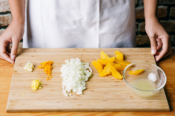 Die Zwiebel und den Knoblauch schälen und fein würfeln. Jeweils 1TL Orangen- und Zitronenschale abreiben. Die Orange dann bis zum Fruchtfleisch schälen und das Fruchtfleisch in ca. 1cm dicke Spalten schneiden. Die Zitrone halbieren und eine Hälfte auspressen. Die übrige Zitrone wird nicht benötigt. Das Brühgewürz in 800ml heißem Wasser auflösen.