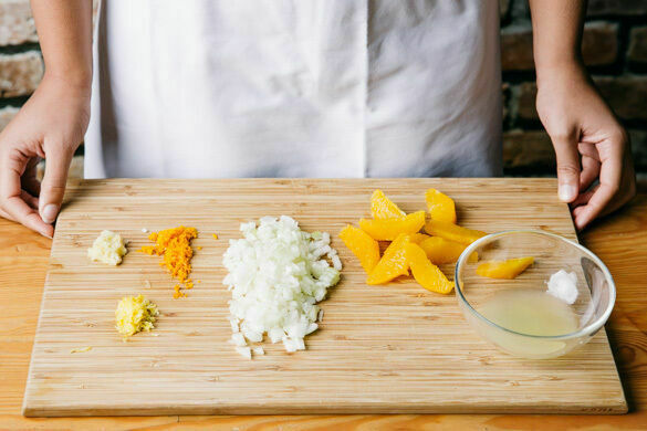 Die Zwiebeln und den Knoblauch schälen und fein würfeln. Jeweils 2TL Orangen- und Zitronenschale abreiben. Die Orangen dann bis zum Fruchtfleisch schälen und das Fruchtfleisch in ca. 1cm dicke Spalten schneiden. Die Zitrone halbieren und auspressen. Das Brühgewürz in 1,5L heißem Wasser auflösen.