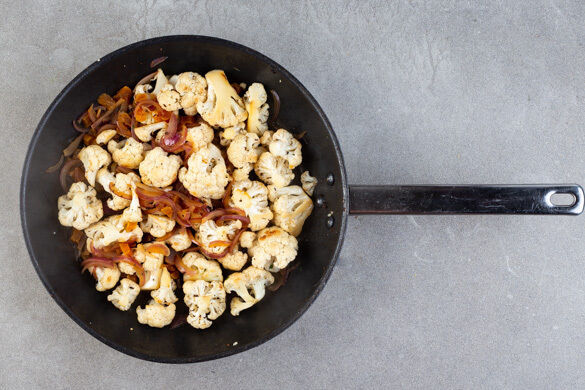 Den Blumenkohl und die Zwiebeln in derselben Pfanne mit 2EL Olivenöl bei mittlerer bis starker Hitze 3–4Min. anbraten. Die getrockneten Aprikosen unterrühren, mit 200ml Wasser ablöschen, dann 3–4Min. abgedeckt köcheln lassen, bis der Blumenkohl bissfest ist. Bei Bedarf etwas mehr Wasser hinzugeben. Mit Salz und Pfeffer abschmecken.