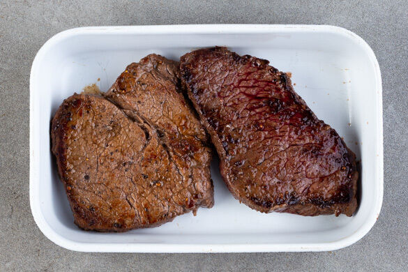 Das Fleisch mit etwas Küchenkrepp trocken tupfen und von beiden Seiten mit Salz und Pfeffer würzen. In einer großen Pfanne mit 2EL Olivenöl bei starker Hitze auf jeder Seite ca. 1Min. scharf anbraten, dann in eine kleine Auflaufform geben und im Ofen noch ca. 5Min. garen, bis das Fleisch medium durch ist. Auf einem Teller bis zum Anschneiden abgedeckt ruhen lassen.
