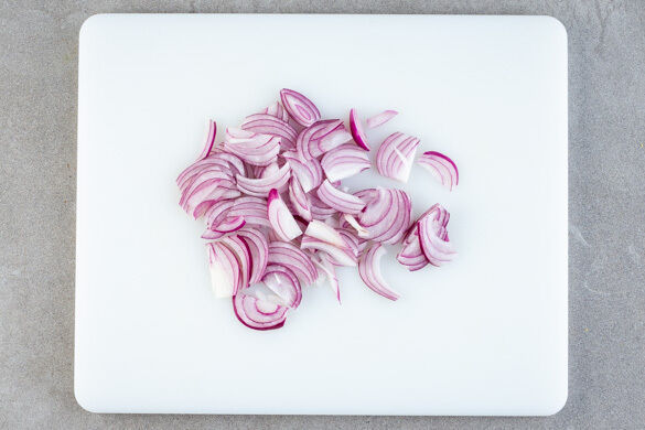 Den Backofen auf 160°C Umluft (180°C Ober-/Unterhitze) vorheizen. Die Zwiebeln schälen, halbieren und in feine Streifen schneiden.