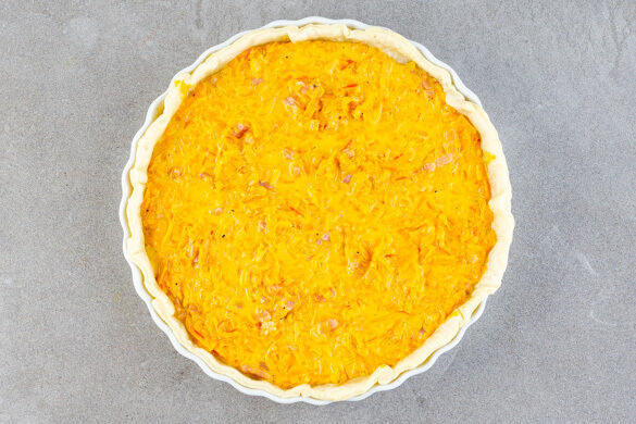Den Teig mit dem Papier nach unten ausrollen und in eine Quicheform legen, überstehenden Rand ggf. abschneiden. Den Boden mit einer Gabel mehrfach einstechen. Die Kürbisfüllung mit dem Guss vermengen, mit Salz und Pfeffer abschmecken und auf dem Teig verteilen. Die Quiche 20–25Min. im Ofen goldbraun backen.