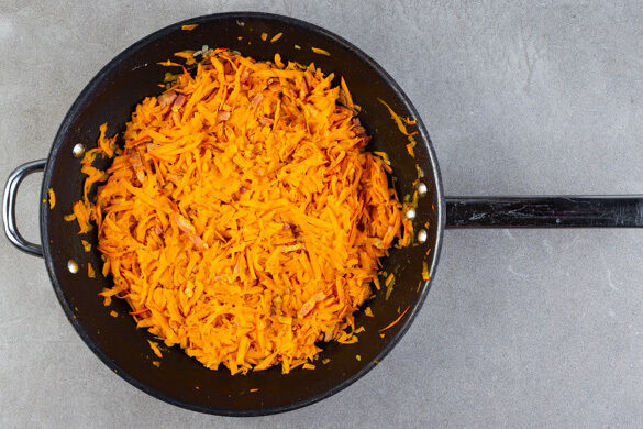 Den Backofen auf 220°C Umluft (240°C Ober-/Unterhitze) vorheizen. Den Kürbis vierteln, mit einem Löffel entkernen und mit einer Küchenreibe grob raspeln. Die Zwiebeln schälen, halbieren und in feine Würfel schneiden. Den Feldsalat ggf. verlesen.