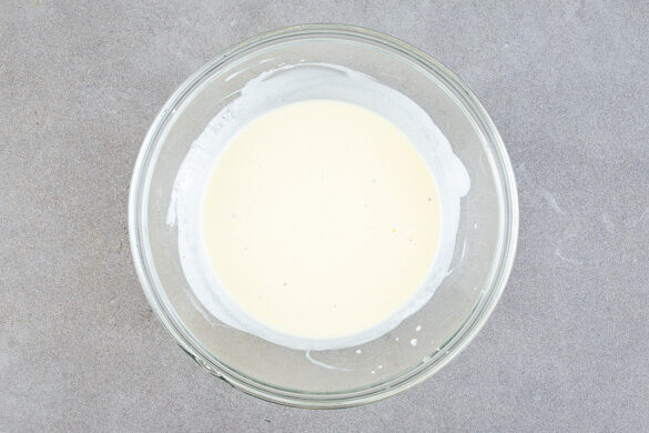 Die Eier mit der Crème fraîche und 50ml Wasser verquirlen. Mit Salz und Pfeffer würzen.