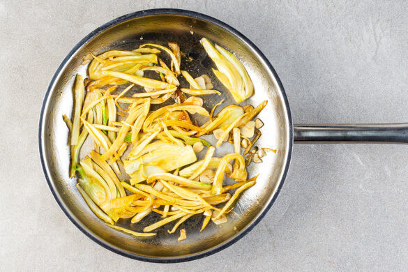 In einem mittelgroßen Topf ausreichend gesalzenes Wasser für die Pasta zum Kochen bringen. Den Fenchel der Länge nach vierteln, dann in dünne Streifen schneiden. Das Fenchelgrün für die Garnitur beiseitelegen. Den Knoblauch schälen und in feine Scheibchen schneiden.