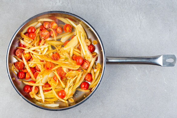 Nebenher die Tomaten halbieren. Mit 3EL Wasser zum Fenchel in die Pfanne geben, 1/2TL Salz und 1 Prise Pfeffer unterrühren und das Gemüse abgedeckt bei mittlerer bis niedriger Hitze 5–8Min. garen.