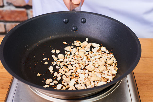 In einem großen Topf ausreichend gesalzenes Wasser zum Kochen bringen. Eine Pfanne auf mittlere Stufe erhitzen und die Cashewnüsse ohne Öl ca. 2-3Min. goldgelb rösten. Den Käse reiben. Die Petersilie grob hacken. Ofen auf 180°C Umluft vorheizen.