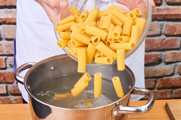 Sobald das Wasser kocht, die Nudeln darin ca. 8-10Min. bissfest kochen. Vor dem Wasser abgießen, 1 Tasse Nudelwasser abschöpfen. Dann das Wasser abgießen und Nudeln abtropfen lassen.