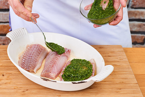 Den Fisch von eventuellen Gräten befreien, in eine feuerfeste, gefettete Form geben, salzen und pfeffern und mit der Hälfte des Pestos bestreichen. Etwas Abrieb der Zitrone darüber streuen. Im Ofen für ca. 10-15Min. gar backen.