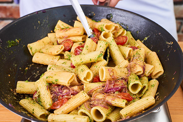 Es gibt Nilbarsch, den wir mit selbstgemachtem Pesto bestreichen und dann im Ofen sanft garen. Das aus Petersilie und gerösteten Cashews pürierte Pesto passt wunderbar zu dem zarten Fisch. Dazu kochen wir noch ein paar Nüdelchen, die wir mit dem restlichen Pesto und süßen Kirschtomaten cremig rühren. Ran an die Töpfe und los geht’s!