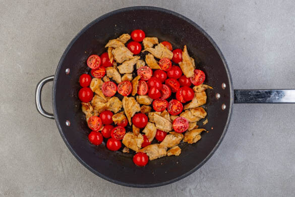 Das „Hähnchen“ in der Pfanne mit 1EL Olivenöl bei starker Hitze 2–3Min. scharf anbraten. Dann die Tomaten dazugeben und 1–2Min. bei mittlerer Hitze mitbraten. Mit Salz und Pfeffer abschmecken.